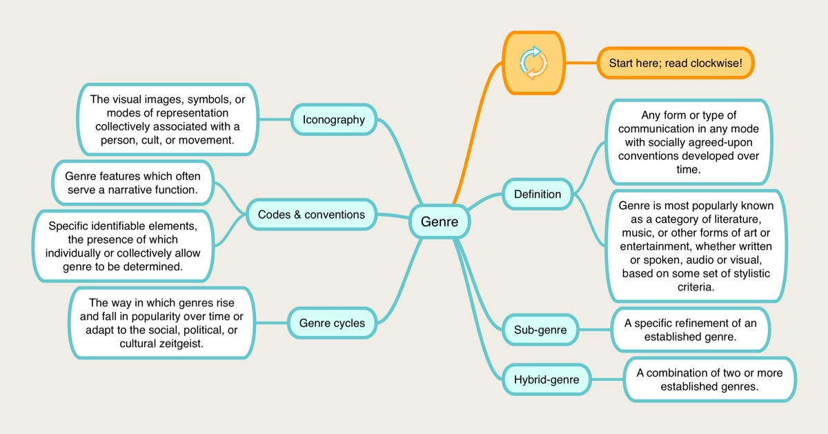 Iconography is “a pattern of signs we associate with a particular genre”. This also allows the audience to identify the genre. An example of this is the futuristic props, setting and costumes used for science fiction films.